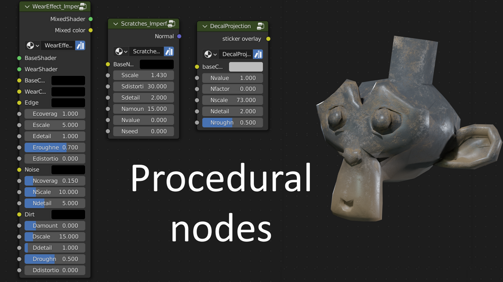 In this imperfection nodes pack you will get 4 nodes to use on pretty much any object. One node to add a wear effect to your objects, aswell as dirt build up. A node for procedural scratches, smudges and a node for decal uv-projection. Check out my youtube:Kv3D video for more information about these nodes